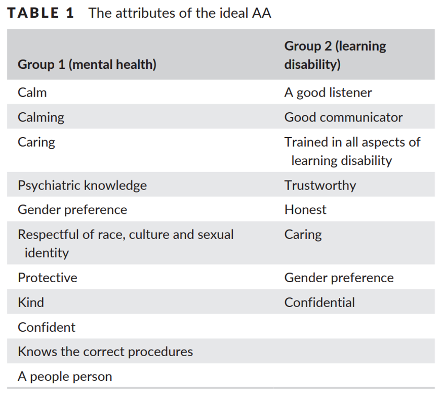 The role of AA is therefore a vital and powerful role for children and vulnerable people when detained by the police. The AA does not and is not required to give legal advice – this is the purview of solicitors. Research with vulnerable adults published in 2017 identified the attributes that made an “ideal” AA. The research had two focus groups, one group being individuals who suffer from mental ill health and the other group having recognised learning disabilities. The groups suggested the following: